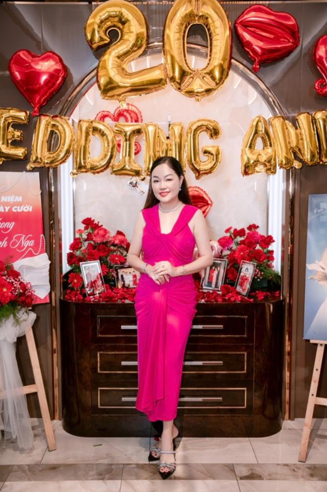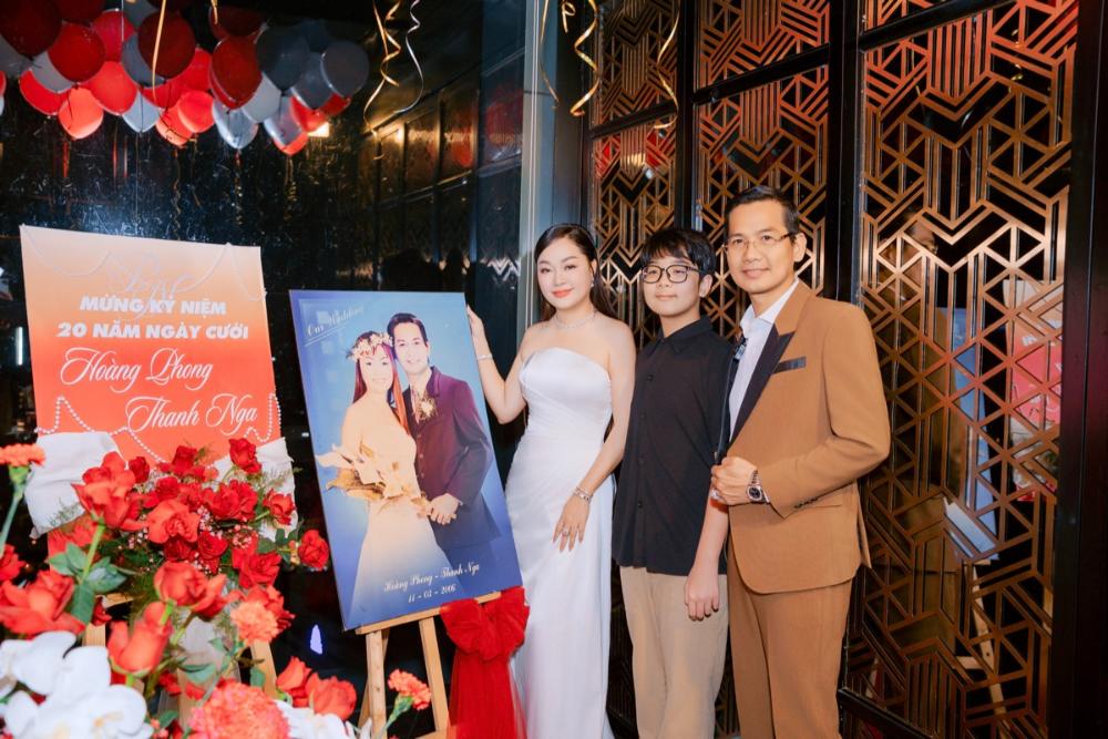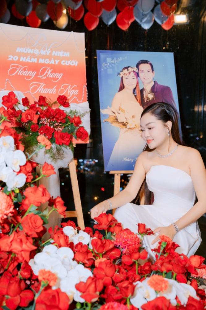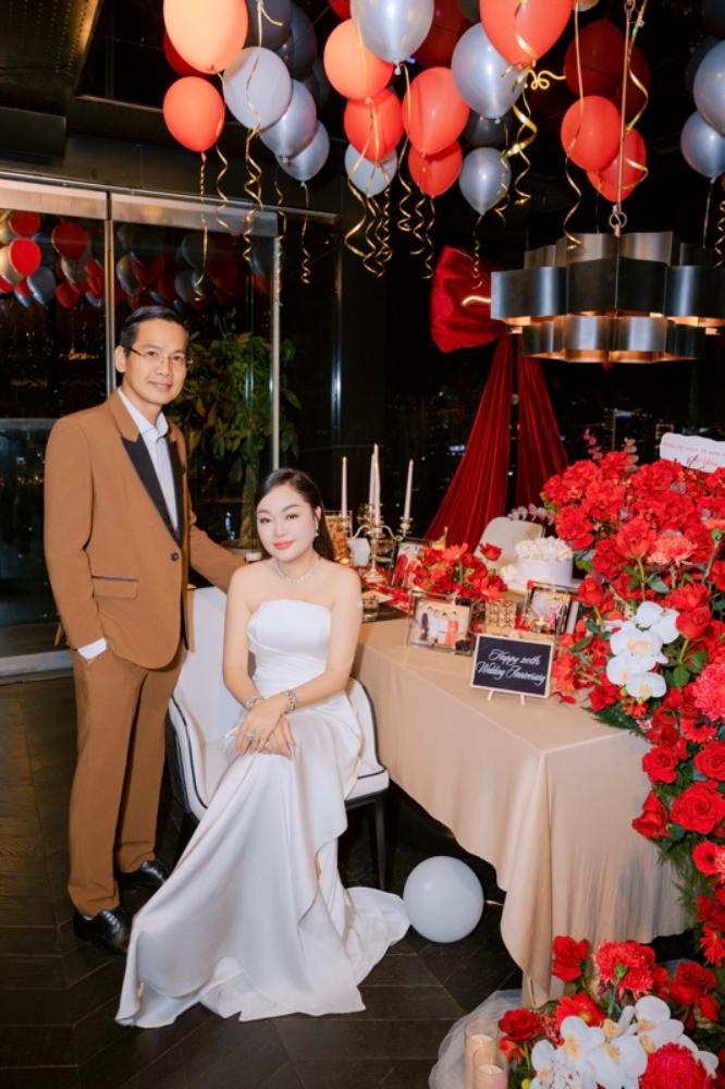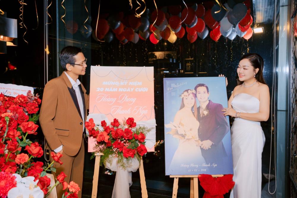 Không gian buổi tiệc được trang trí tinh tế với sắc đỏ của hoa hồng, ánh nến lung linh cùng những tấm ảnh cưới được trưng bày trang trọng. Điểm nhấn đặc biệt là bức ảnh cưới cách đây hai thập kỷ của cặp đôi, như một lời nhắc nhẹ nhàng về hành trình bắt đầu từ tình yêu để xây dựng nên một mái ấm bền vững suốt 20 năm qua.