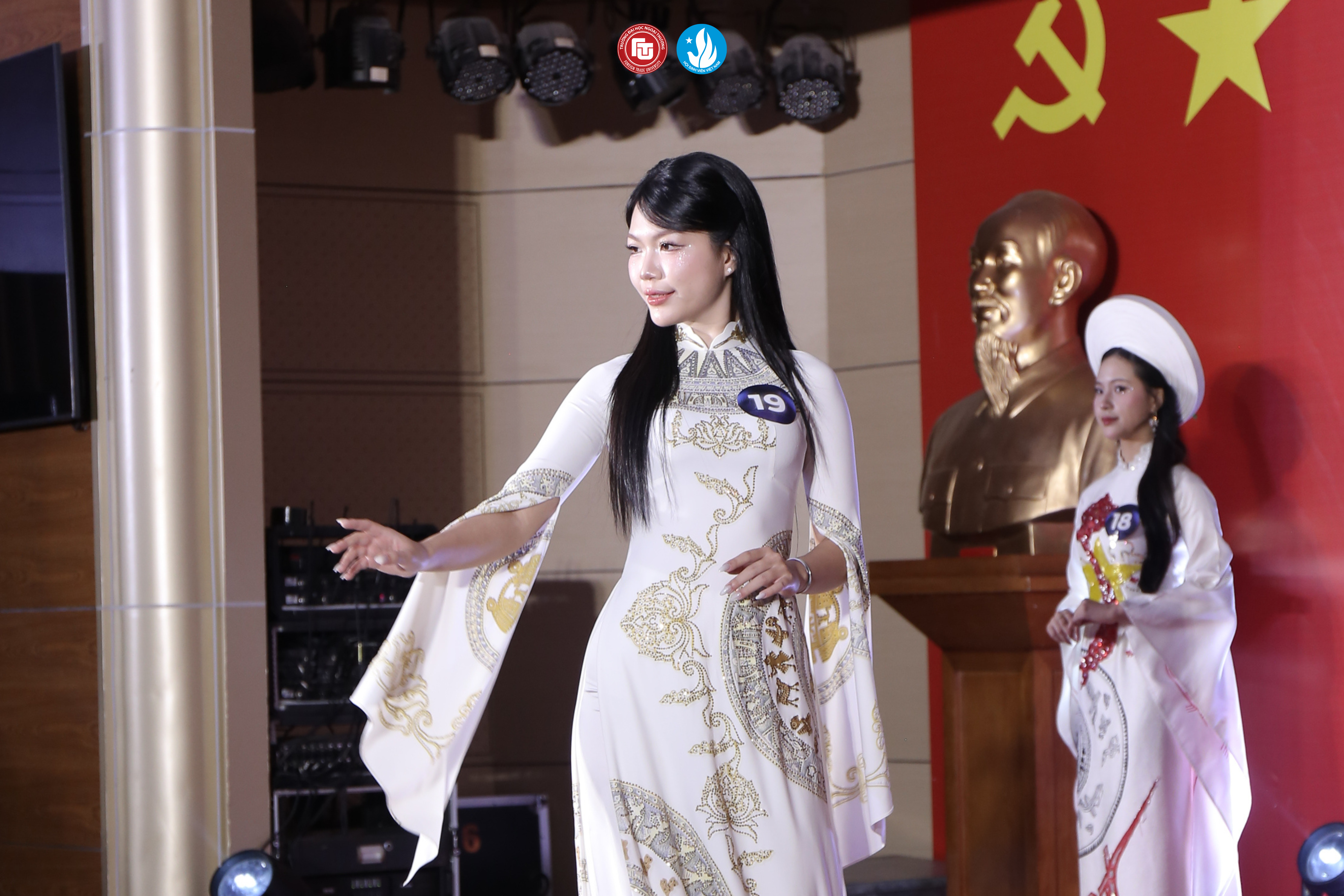 Tiếp đến, phần thi áo dài mở ra một không gian tôn vinh vẻ đẹp nhẹ nhàng nhưng kiêu hãnh của các thí sinh. Từng bước đi mềm mại, uyển chuyển, kết hợp cùng ánh mắt tự tin và nụ cười rạng rỡ, các cô gái biến tà áo dài thành câu chuyện riêng về sự thanh lịch và cá tính. Không chỉ là màn trình diễn trang phục phần thi còn phản ánh bản lĩnh, sự tinh tế trong cách ứng xử và khả năng truyền tải cảm xúc, để lại ấn tượng sâu sắc trong lòng khán giả.