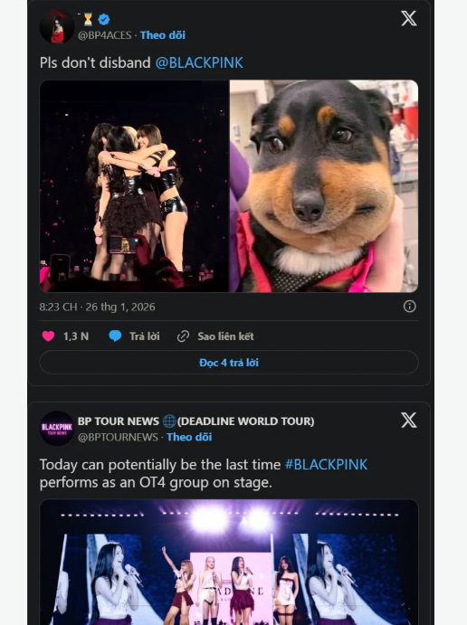 Ở thời điểm hiện tại, mọi suy đoán về tương lai của BLACKPINK vẫn chỉ dừng lại ở mức phỏng đoán. Chưa có bất kỳ thông tin chính thức nào từ YG Entertainment hay các thành viên liên quan đến vấn đề hợp đồng hay định hướng lâu dài của nhóm. Do đó, nhiều ý kiến cho rằng thay vì vội vàng lo lắng, người hâm mộ có lẽ nên nhìn nhận khoảnh khắc xúc động tại DEADLINE như một dấu chấm đầy cảm xúc cho một hành trình lưu diễn rực rỡ, đồng thời mở ra kỳ vọng cho những bước đi tiếp theo của BLACKPINK – dù là trên con đường solo hay trong đội hình bốn người quen thuộc.