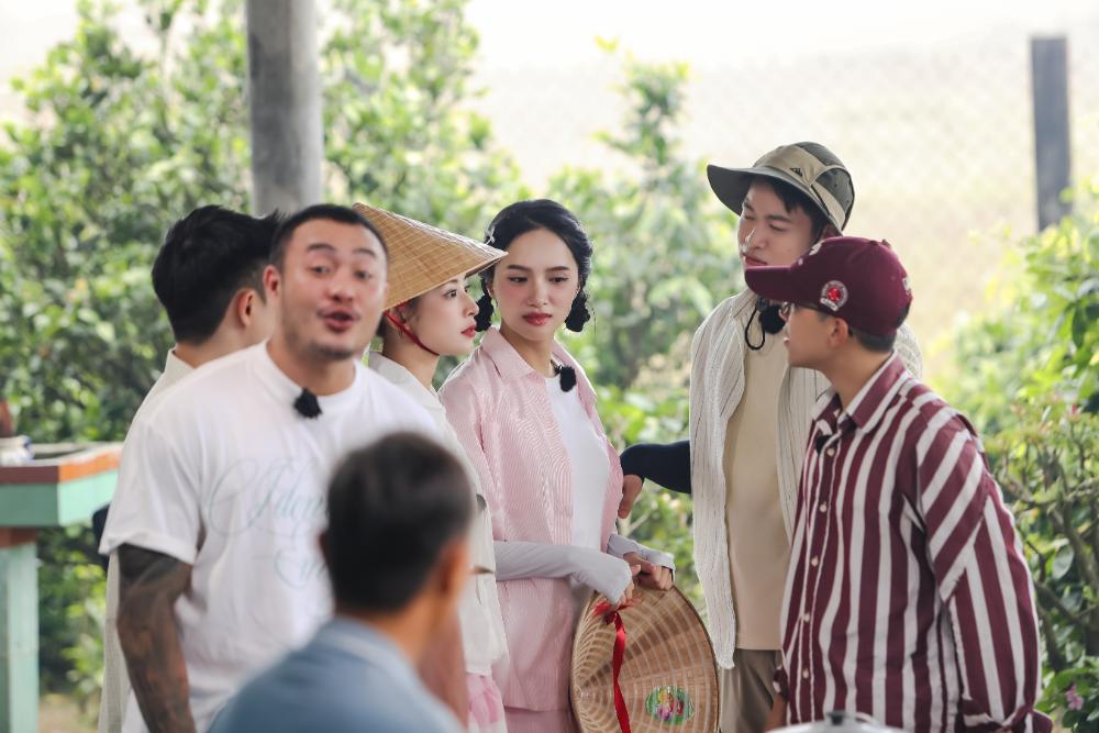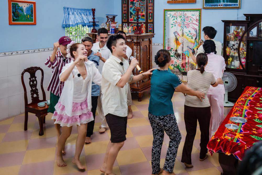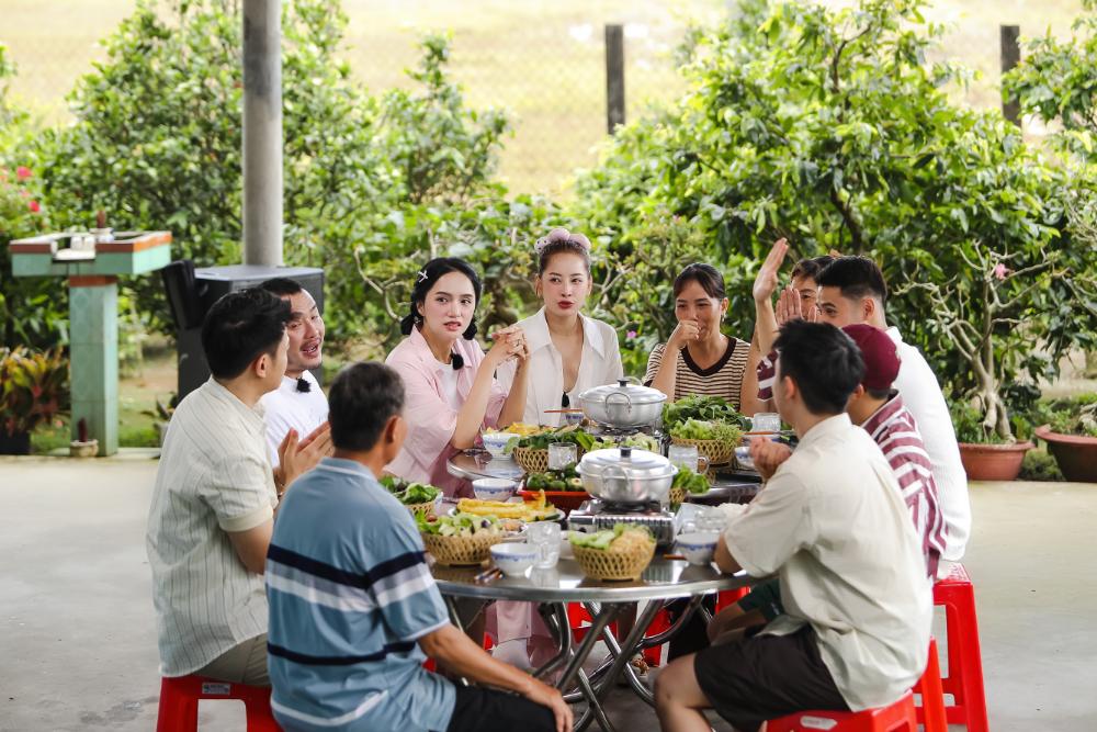 Trong không gian bữa tiệc, dàn cast cũng được lắng nghe thêm về câu chuyện lúa gạo từ các nông dân và không khỏi bất ngờ bởi sự vất vả, cố gắng của bà con tại đây. Không khí còn trở nên nhộn nhịp hơn bao giờ bởi màn góp giọng của các cô chú hàng xóm và cùng nhau nhâm nhi rượu chuối hột dưới cơn mưa bất chợt.