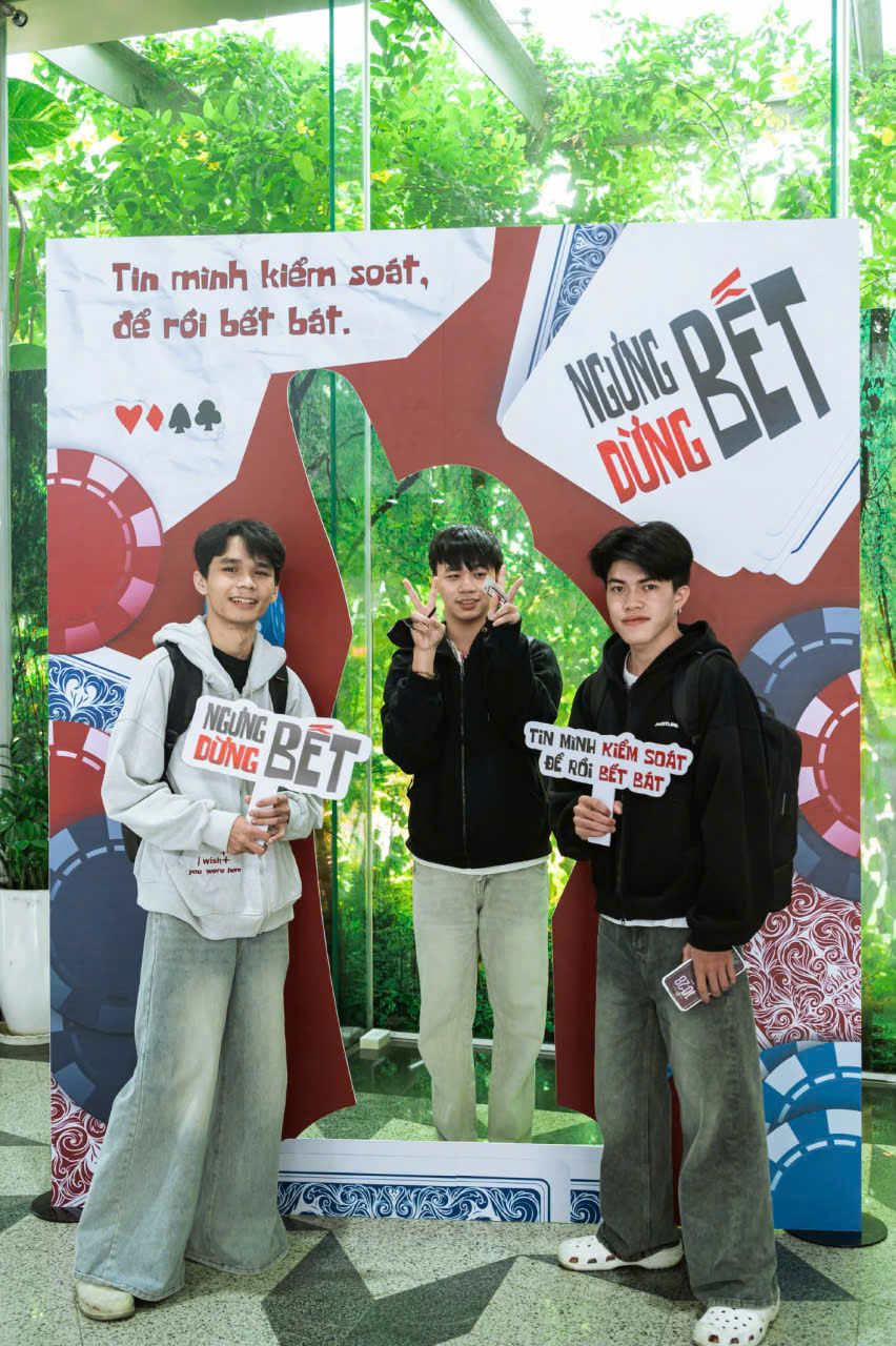 Song song đó, booth tương tác “Bingo Bết” (20–21/03) và sự kiện trải nghiệm chính (06–07/04) tại Trường Đại học FPT TP.HCM được thiết kế như một hành trình mô phỏng. Người tham gia lần lượt đi qua các khu vực “Bet – Ngửa Bài – Bết – Lựa Chọn”, từ cảm giác dễ thắng ban đầu đến nhận diện hệ quả và đối diện quyết định dừng lại hay tiếp tục. Cách tổ chức này giúp người trẻ trực tiếp cảm nhận cách các yếu tố tâm lý chi phối hành vi cá cược.