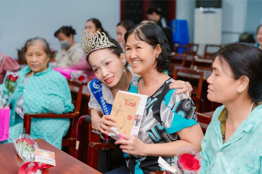 Tại buổi trao quà, đương kim Hoa hậu – cô giáo Nguyễn Thi Minh Tâm chia sẻ: “Minh Tâm từng là bệnh nhân sau khi bị biến cố mất chân, mình hiểu và cảm nhận được tinh thần quan trọng như thế nào đối với người bệnh nên khi đến bệnh viện Chấn thương Chỉnh hình gặp các chị bệnh nhân khó khăn, mình thực sự xúc động và cảm thấy gần gũi. Phần quà của chúng mình không chỉ một phần vật chất mà nhiều còn là tình cảm, sự yêu thương và cả sự đồng cảm gửi các chị. Nhìn thấy các chị vui, xúc động, mình càng hạnh phúc và cảm nhận nhiều hơn ý nghĩa của việc sẻ chia.”
