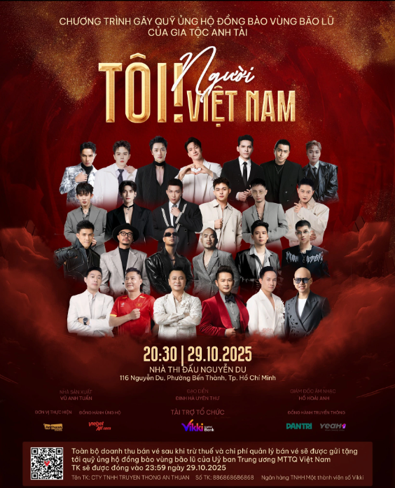Xuất phát từ mong muốn được san sẻ phần nào khó khăn với đồng bào vùng bão lũ, “Gia tộc Anh tài” đã cùng nhau tổ chức đêm nhạc gây quỹ từ thiện mang tên Tôi! Người Việt Nam vào 20h30 ngày 29/10 tại Nhà thi đấu Nguyễn Du, TPHCM.