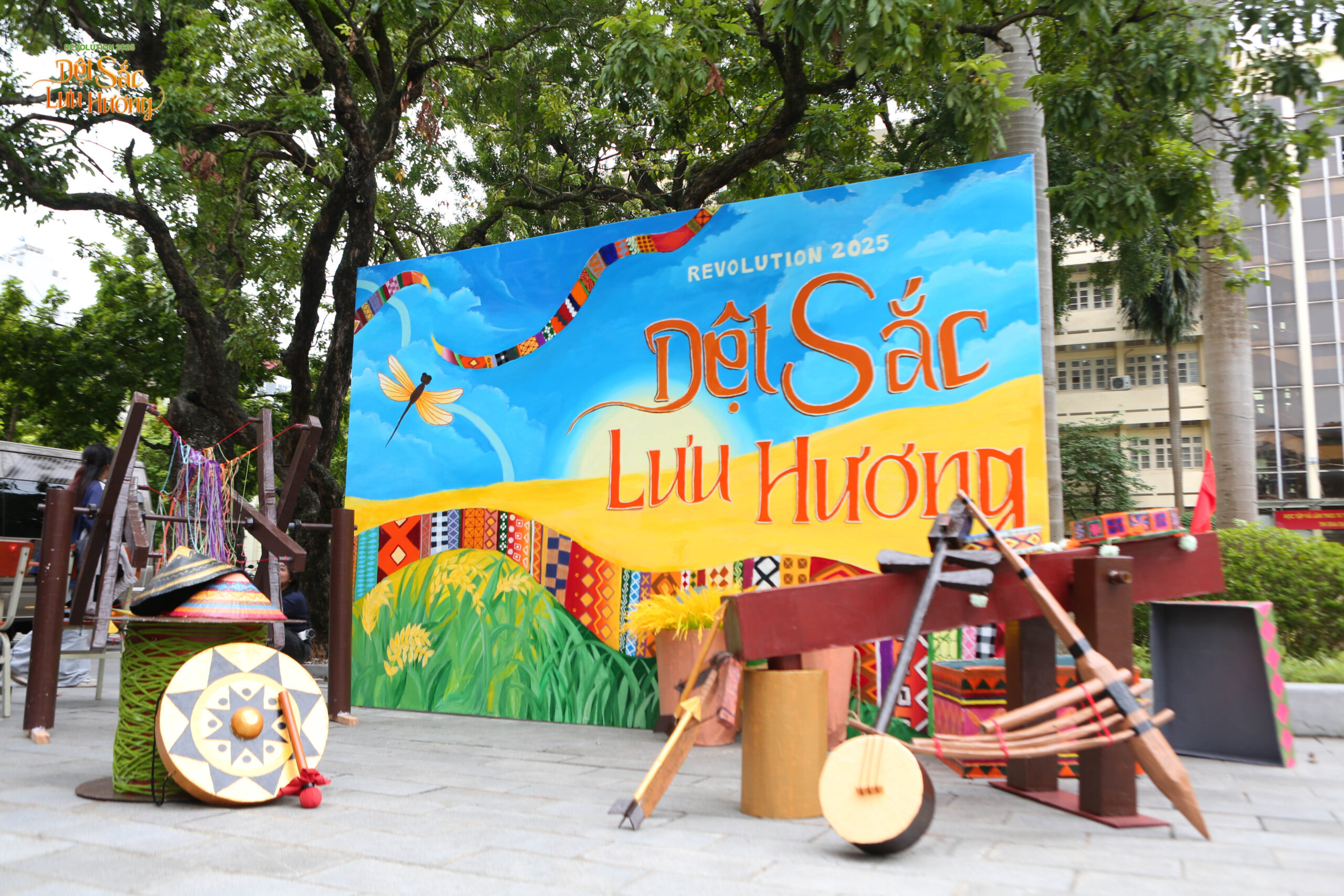 Lấy cảm hứng từ phiên chợ quê Việt Nam – nơi giao hòa giữa âm thanh, sắc màu và bản sắc dân gian – photobooth “Thanh Âm Sắc Cẩm” được tái hiện bằng những chất liệu mộc mạc, họa tiết truyền thống và sắc thổ cẩm rực rỡ. Từ khung dệt, cây lúa đến các biểu trưng âm nhạc dân gian, từng chi tiết đều góp phần tạo nên không gian vừa thân thuộc, vừa hiện đại, phản ánh đúng tinh thần “dệt sắc – lưu hương” mà chương trình hướng đến.