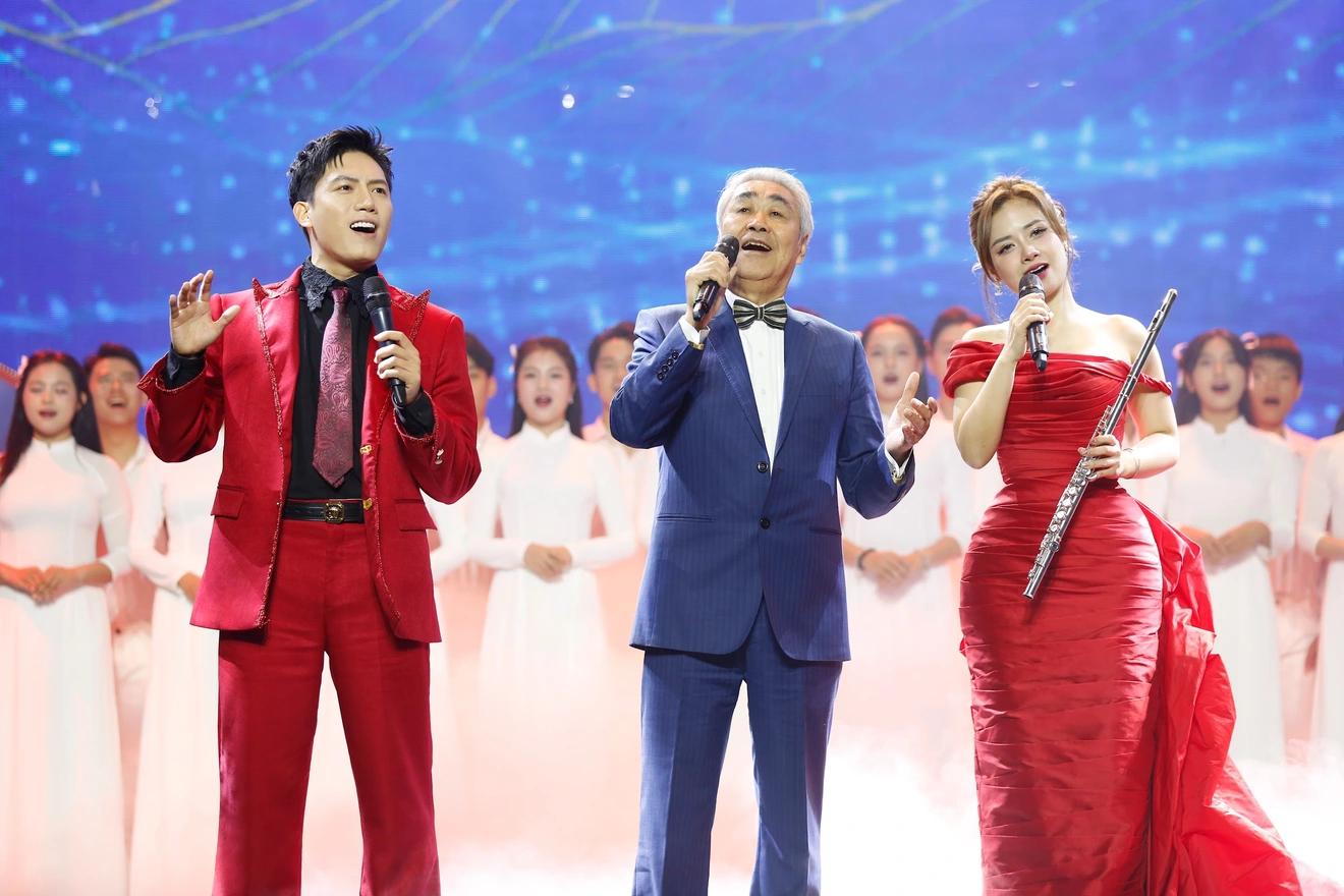Từ trái sang: Ca sĩ An Tú, NSND Quang Thọ và Dương Hoàng Yến thể hiện ca khúc “Tổ quốc tôi chưa đẹp thế bao giờ” (Ảnh: Ban tổ chức).