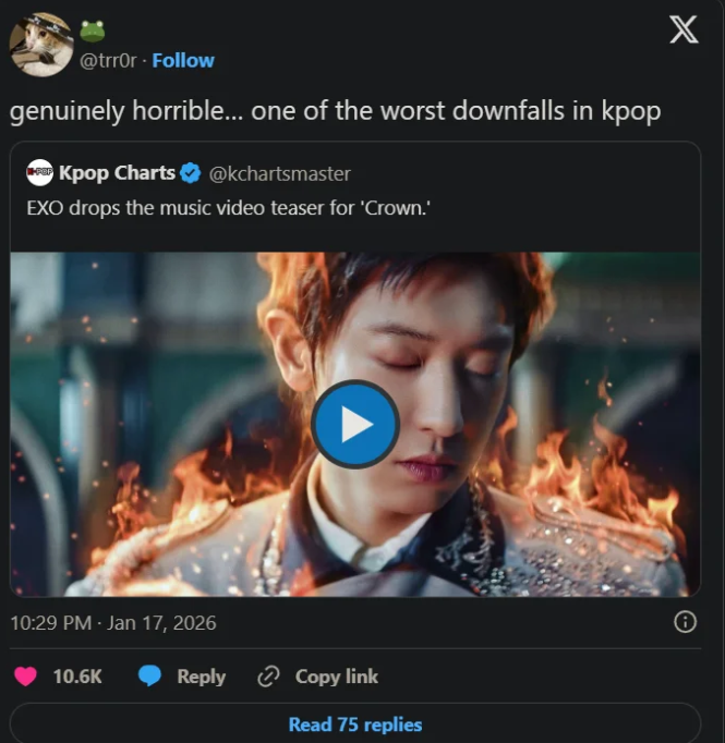 Ngay sau khi teaser được phát hành, nhiều ý kiến chỉ trích đã xuất hiện dày đặc trên các nền tảng mạng xã hội và diễn đàn trực tuyến. Trọng tâm của tranh cãi nằm ở phần âm nhạc của “Crown”. Không ít người nghe cho rằng ca khúc này thiếu đi màu sắc quen thuộc vốn gắn liền với tên tuổi EXO suốt nhiều năm qua. Thay vào đó, giai điệu và cách xử lý âm thanh bị đánh giá là xa lạ, thậm chí mờ nhạt, khiến một bộ phận khán giả đặt câu hỏi liệu nhóm có đang đánh mất bản sắc âm nhạc từng giúp họ khẳng định vị thế hàng đầu trong K-pop.