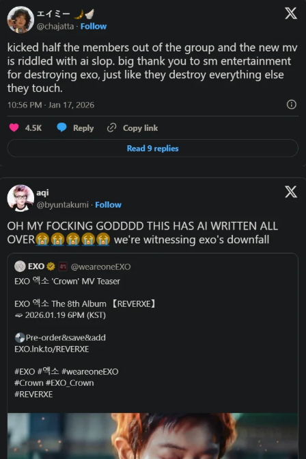 Thực tế, làn sóng phản ứng tiêu cực này không hoàn toàn bất ngờ. Trước đó, khi SM Entertainment công bố kế hoạch tái xuất của EXO vào cuối tháng 11, cộng đồng người hâm mộ đã sớm bày tỏ sự lo ngại xoay quanh việc vắng mặt ba thành viên Baekhyun, Chen và Xiumin (CBX). Sự thiếu hụt đội hình này từng gây ra nhiều tranh luận gay gắt, và việc teaser “Crown” ra mắt trong bối cảnh đó dường như đã khiến những bức xúc âm ỉ càng bùng lên mạnh mẽ.
