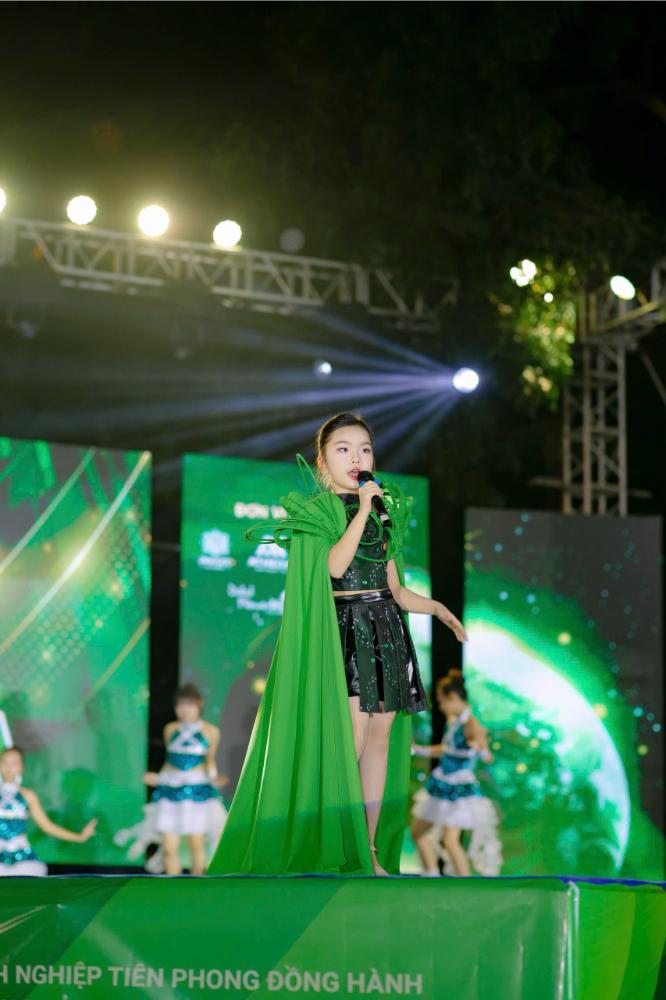 Đáng chú ý, trong khuôn khổ Concert Xanh Quốc Gia, Lê Ngọc Minh Giang không chỉ tỏa sáng trên sàn diễn thời trang mà còn để lại dấu ấn sâu đậm trong vai trò ca sĩ. Trên sân khấu lớn, hoa hậu nhí tự tin cất giọng thể hiện ca khúc “Trái đất này là của chúng mình” bằng cả tiếng tiếng Anh và tiếng Việt, truyền tải trọn vẹn thông điệp trong trẻo, giàu cảm xúc về tình yêu thiên nhiên và trách nhiệm của thế hệ trẻ đối với hành tinh xanh. Phần trình diễn song ngữ đầy cảm xúc của Minh Giang đã nhận được những tràng pháo tay vang dội từ khán giả, trở thành một trong những khoảnh khắc giàu ý nghĩa và đáng nhớ nhất của đêm diễn.