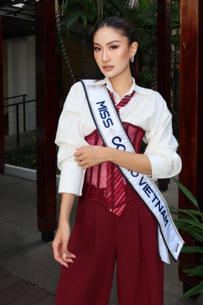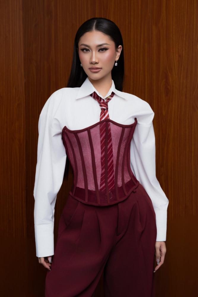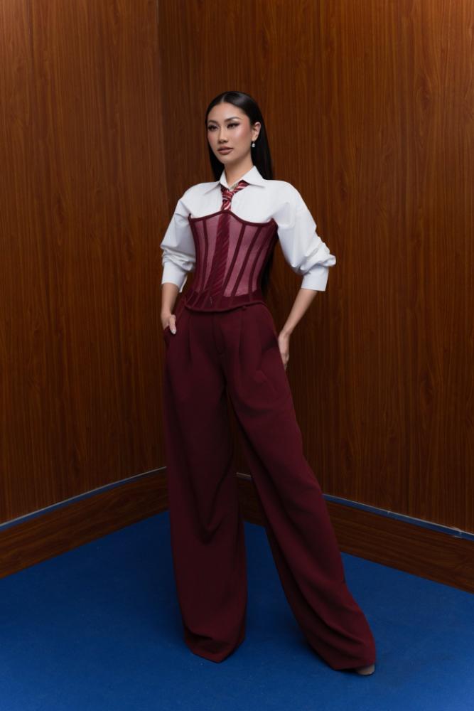 Dù gặp phải một số vấn đề sức khỏe về mắt, người đẹp vẫn giữ tinh thần lạc quan, chủ động tham gia mọi hoạt động. Ở ngày thứ 4, Phương Linh tiếp tục gây ấn tượng với outfit menswear phá cách: Sơ mi trắng tay dài xắn nhẹ, layer cùng corset đỏ burgundy, quần ống suông và cà vạt đỏ sọc. Bộ trang phục toát lên vẻ hiện đại, cá tính nhưng vẫn sang trọng.