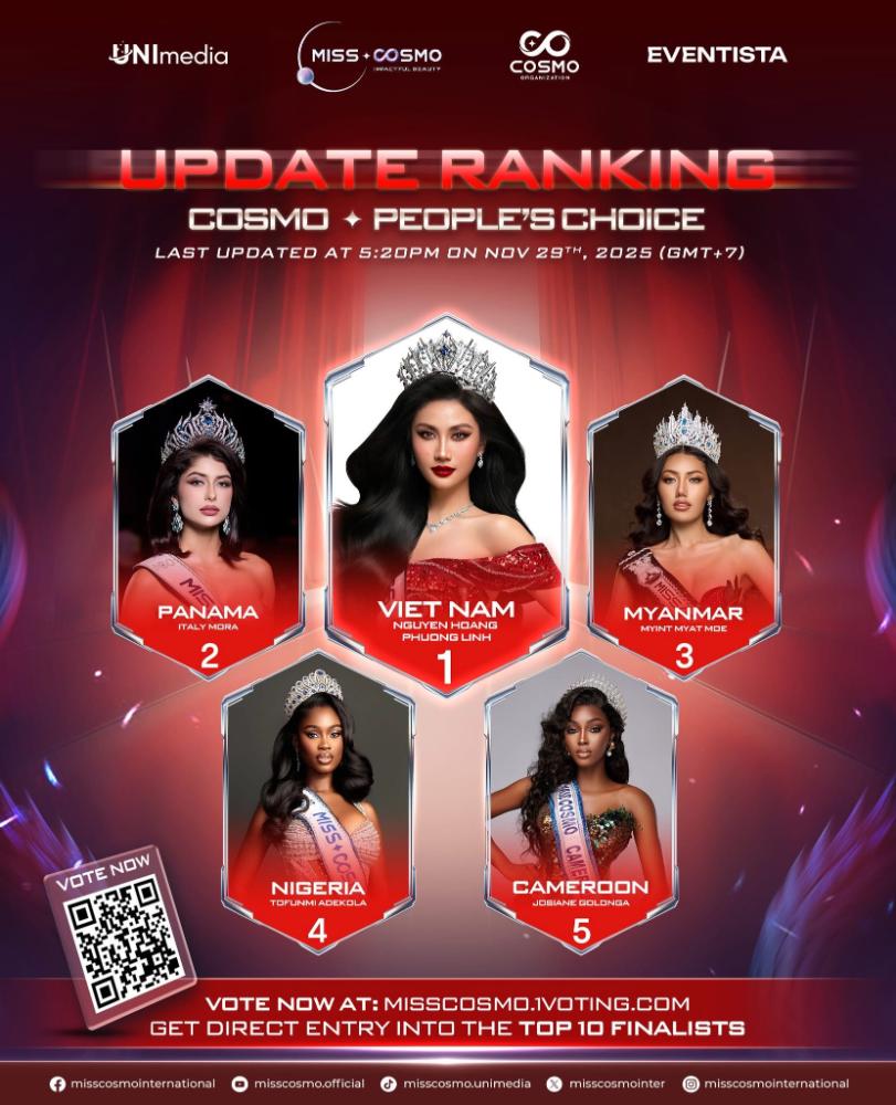 Chỉ sau chưa đầy 24 giờ mở cổng bình chọn Miss Cosmo 2025, Đương kim Miss Cosmo Vietnam – Hoa Hậu Hoàn Vũ Việt Nam Nguyễn Hoàng Phương Linh đã vươn lên dẫn đầu bảng xếp hạng “Cosmo People’s Choice”, tạo nên sự phấn khích lớn cho người hâm mộ.