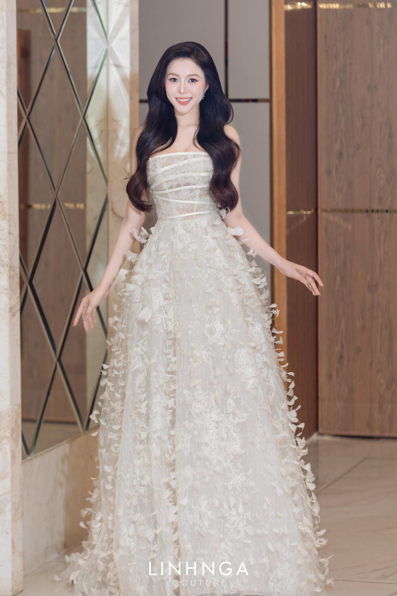 Bộ trang phục được kiến tạo với form corset kinh điển, kết hợp hàng nghìn chi tiết thêu tay và đính kết thủ công tỉ mỉ. Trên nền vải xuyên thấu, lớp lông vũ mềm nhẹ phủ lên tựa làn sương sớm, chuyển động uyển chuyển theo từng bước đi, tạo nên hình ảnh một “nữ hoàng sắc đẹp” vừa thanh khiết, vừa kiêu hãnh.