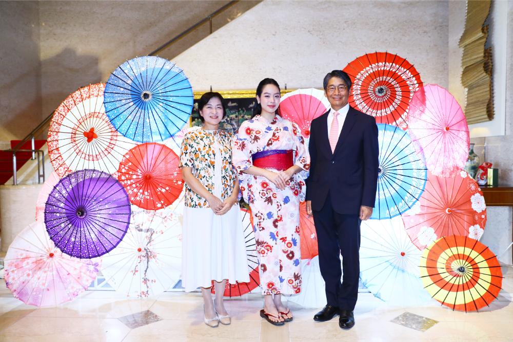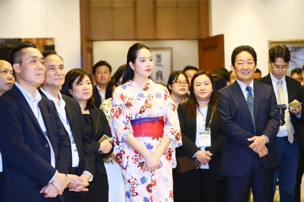 Xuất hiện duyên dáng trong Yukata truyền thống, Hoa hậu Thanh Thủy gây ấn tượng với phong thái rạng rỡ và gần gũi. Cô cùng Đại sứ Nhật Bản và phu nhân tham gia nghi thức đập rượu kagami biraki – biểu tượng cho sự khởi đầu mới và lời chúc may mắn, đánh dấu khoảnh khắc giàu ý nghĩa văn hóa và ngoại giao.