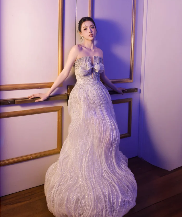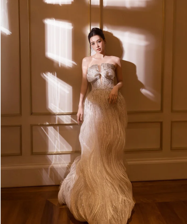 Trong loạt ảnh, Tiểu Vy xuất hiện trong thiết kế đầm dạ hội cúp ngực tông ánh bạc – nude, được đính kết cầu kỳ với những đường tua lấp lánh ôm sát vóc dáng. Phần thân váy tạo điểm nhấn bằng chi tiết nơ mềm mại, vừa tôn vòng một gợi cảm vừa giữ được vẻ tinh tế, sang trọng. Phom dáng váy dài thướt tha giúp nàng hậu khoe trọn lợi thế hình thể cùng tỷ lệ cơ thể cân đối.