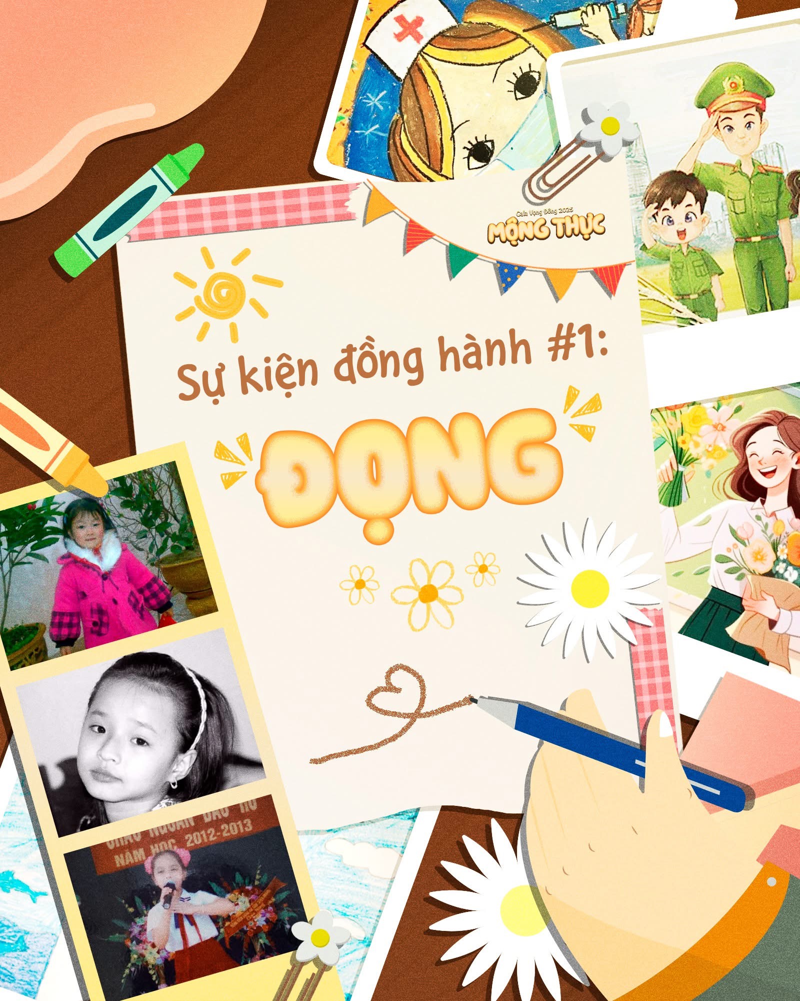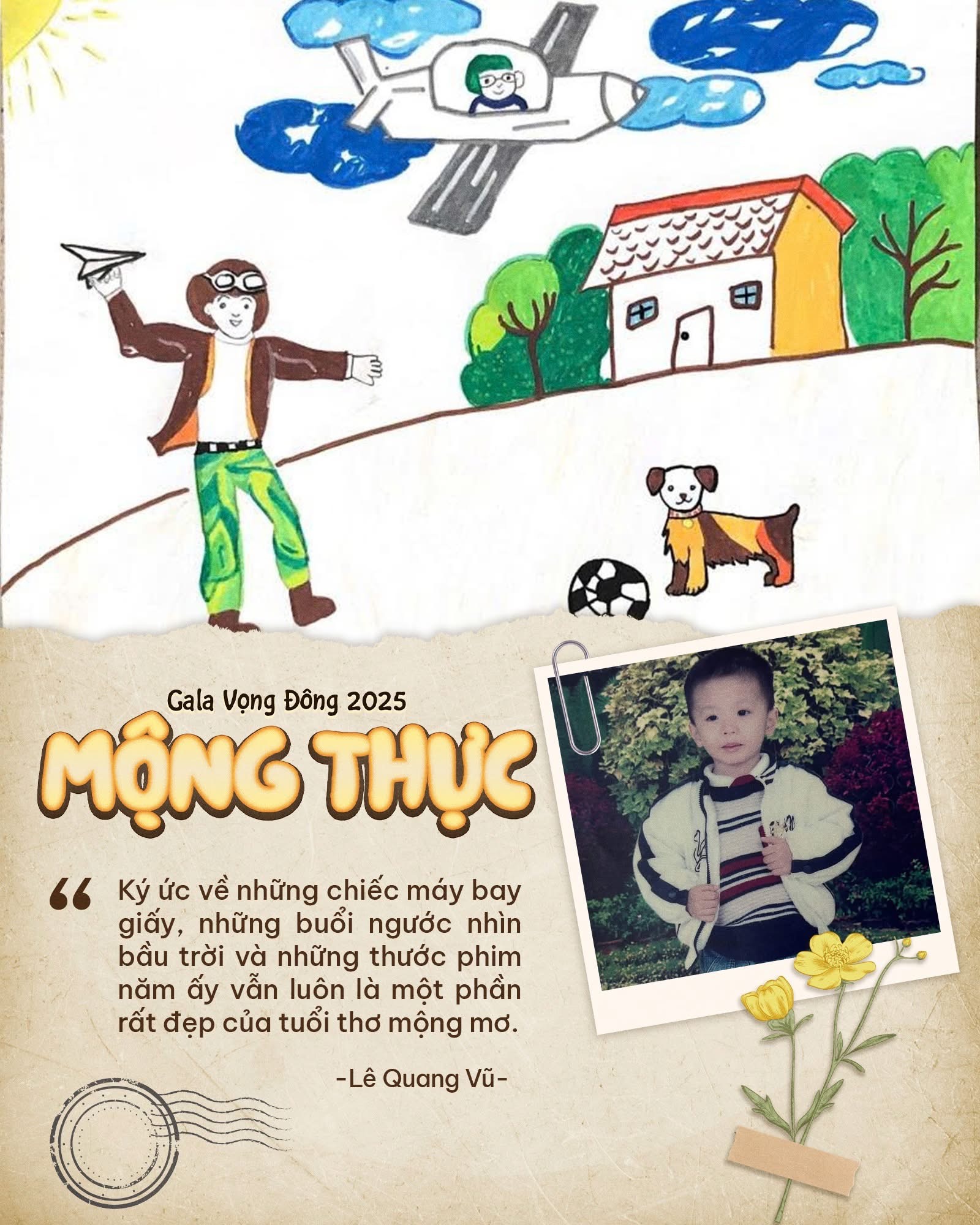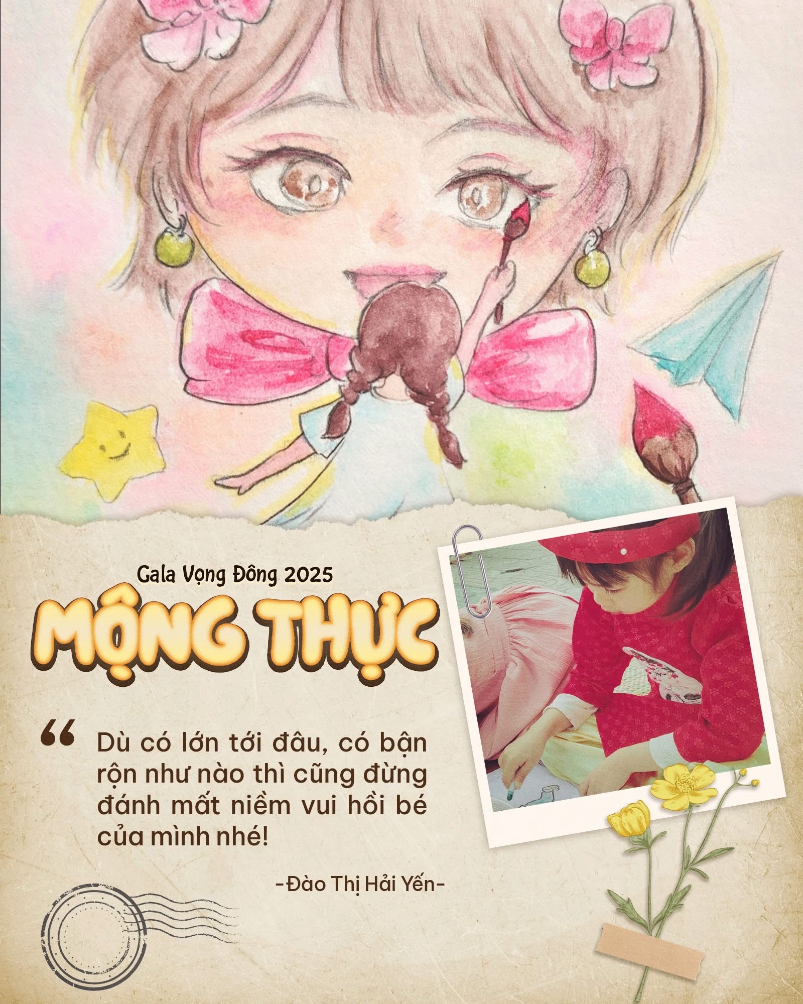 Để tham gia “chuyến tàu” trở về tuổi thơ, mỗi thí sinh cần gửi bài dự thi về fanpage “Gala Vọng Đông 2025: Mộng Thực”. Bài thi bao gồm: một bức tranh từng vẽ khi còn nhỏ (có thể phục chế tranh cũ hoặc vẽ lại ước mơ tuổi thơ), một tấm ảnh thời thơ ấu kèm theo những lời nhắn gửi, sẻ chia về câu chuyện phía sau mỗi nét vẽ. Dù là những đường nét nguệch ngoạc hay những gam màu vụng về, mỗi tác phẩm đều chứa đựng cả một vùng ký ức tuổi thơ, là điểm tựa tinh thần nuôi dưỡng mỗi người trong hành trình “tập lớn”.