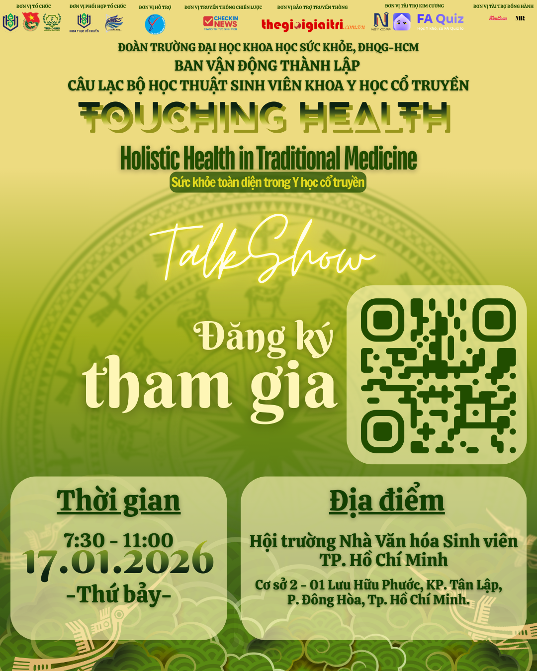 TP. Hồ Chí Minh – Trong bối cảnh nhịp sống học tập hiện đại đặt sinh viên trước nhiều áp lực về thời gian, tinh thần và thể chất, chương trình talkshow “SỨC KHỎE TOÀN DIỆN” thuộc dự án “Touching Health” sẽ chính thức diễn ra vào 7g30 ngày 17/01/2026 tại Hội trường Nhà Văn hóa Sinh viên TP. Hồ Chí Minh (Cơ sở 2), với sự tham gia dự kiến của 500 sinh viên đến từ các trường đại học trên địa bàn.