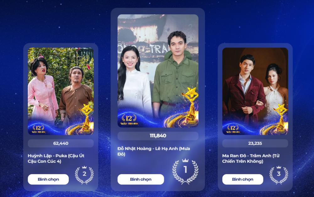 Sang Cặp đôi được yêu thích nhất, bảng xếp hạng cũng cho thấy sự phân hóa rõ rệt. Đỗ Nhật Hoàng – Lê Hạ Anh (Mưa Đỏ) hiện tạm dẫn đầu với 111.660 lượt bình chọn, theo sau là Huỳnh Lập – PuKa (Cậu Út Cậu Con Cúc 4) đạt 62.440 lượt bình chọn. Vị trí thứ ba thuộc về Ma Ran Đô – Trâm Anh (Từ Chiến Trên Không) với 23.235 lượt bình chọn.