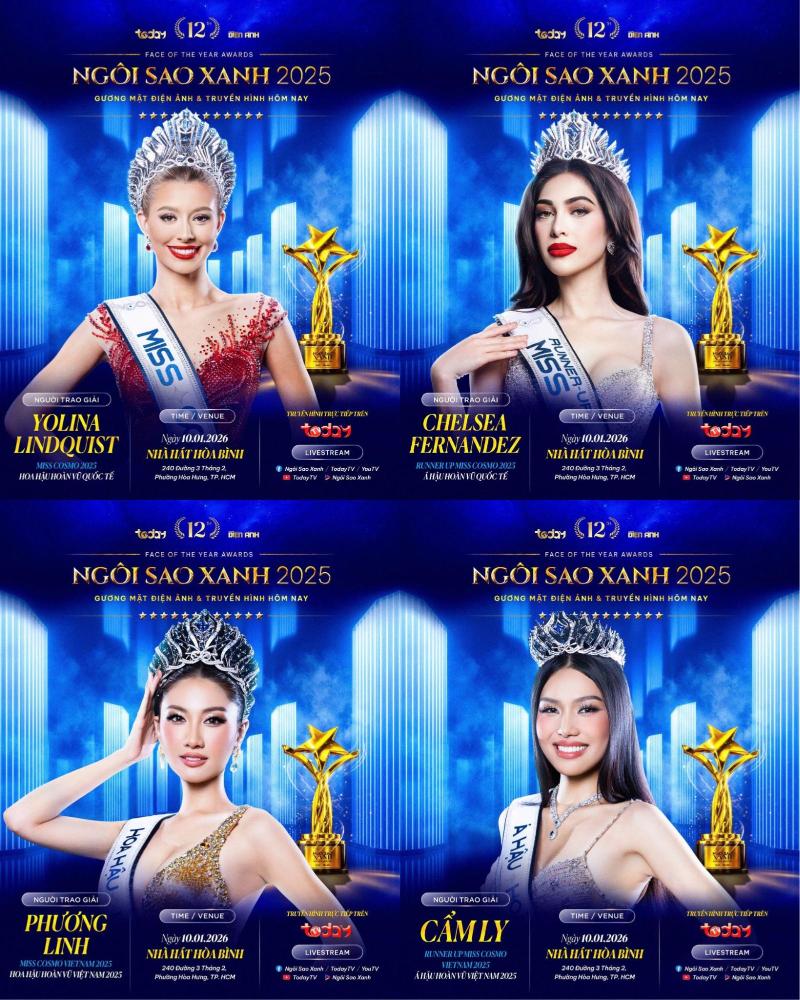 Bên cạnh đó, sự xuất hiện của các người đẹp quốc tế và cả trong nước: Miss Cosmo 2025 Yolina Lindquist, Runner-up Miss Cosmo 2025 Chelsea Fernandez, Miss International 2024 – Thanh Thủy, Miss Cosmo Vietnam 2025 – Phương Linh, Mr World Vietnam 2024 – Tuấn Ngọc,…. hứa hẹn mang đến hình ảnh sang trọng, trẻ trung và sức hút nổi bật cho sân khấu trao giải Ngôi Sao Xanh năm nay.
