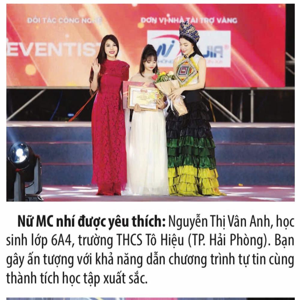 Là học sinh lớp 6A4, Trường THCS Tô Hiệu, TP. Hải Phòng, Vân Anh đã chinh phục công chúng bằng lối dẫn dắt tự tin, giọng nói truyền cảm cùng phong thái sân khấu cuốn hút của một MC nhí đầy triển vọng.
