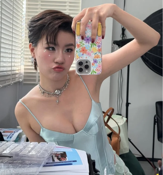 Những hình ảnh mới được chia sẻ cho thấy Pháo linh hoạt biến hóa trong nhiều phong cách khác nhau. Từ bộ váy ngắn kiểu overall caro xanh nhạt phối nơ trắng, kết hợp găng tay dài và bánh kem bên cạnh tạo cảm giác vừa dễ thương vừa gợi cảm trong không gian phòng khách sạn sang trọng… Ảnh: IGNV