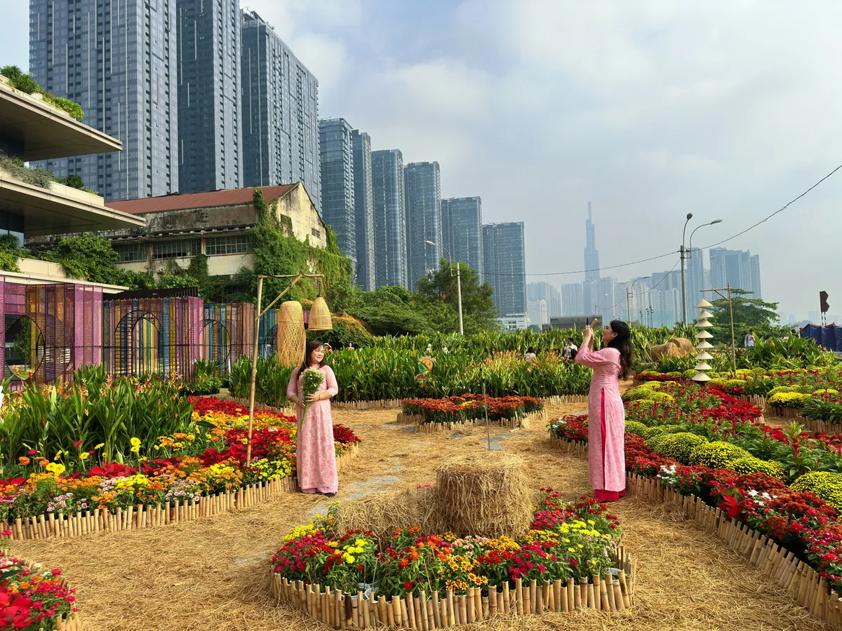 Dịp nghỉ Tết Dương lịch vừa qua, khu vực này luôn tấp nập người tới tham quan, ngắm cảnh, chụp hình. Ngọc Lan (22 tuổi, sinh viên Đại học Khoa học Xã hội & Nhân văn) hào hứng chia sẻ: “Nhóm mình hẹn nhau đi tàu metro từ bến xe miền Đông lên đây, vừa nhanh vừa mát mẻ. Mình bất ngờ vì ngay giữa trung tâm thành phố lại có một góc đậm chất quê thế này. Thời tiết hơi se lạnh khiến cho việc mặc áo dài nhiều lớp trở nên dễ chịu hơn. Chụp hình lâu không bị mệt vì nắng nóng. Ngắm các tiểu cảnh nơi đây, mình cảm thấy nôn nao khi thấy tràn ngập sắc Xuân và háo hức mong đến Tết để được về nhà đoàn tụ với gia đình”.