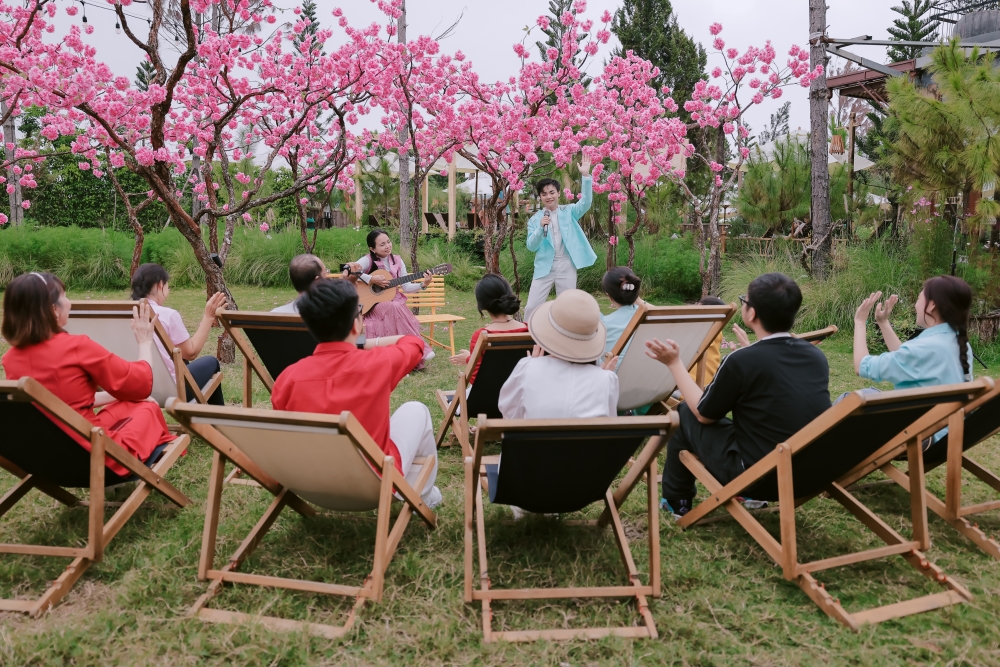 Bối cảnh trình diễn được đặt giữa rừng đào nên thơ