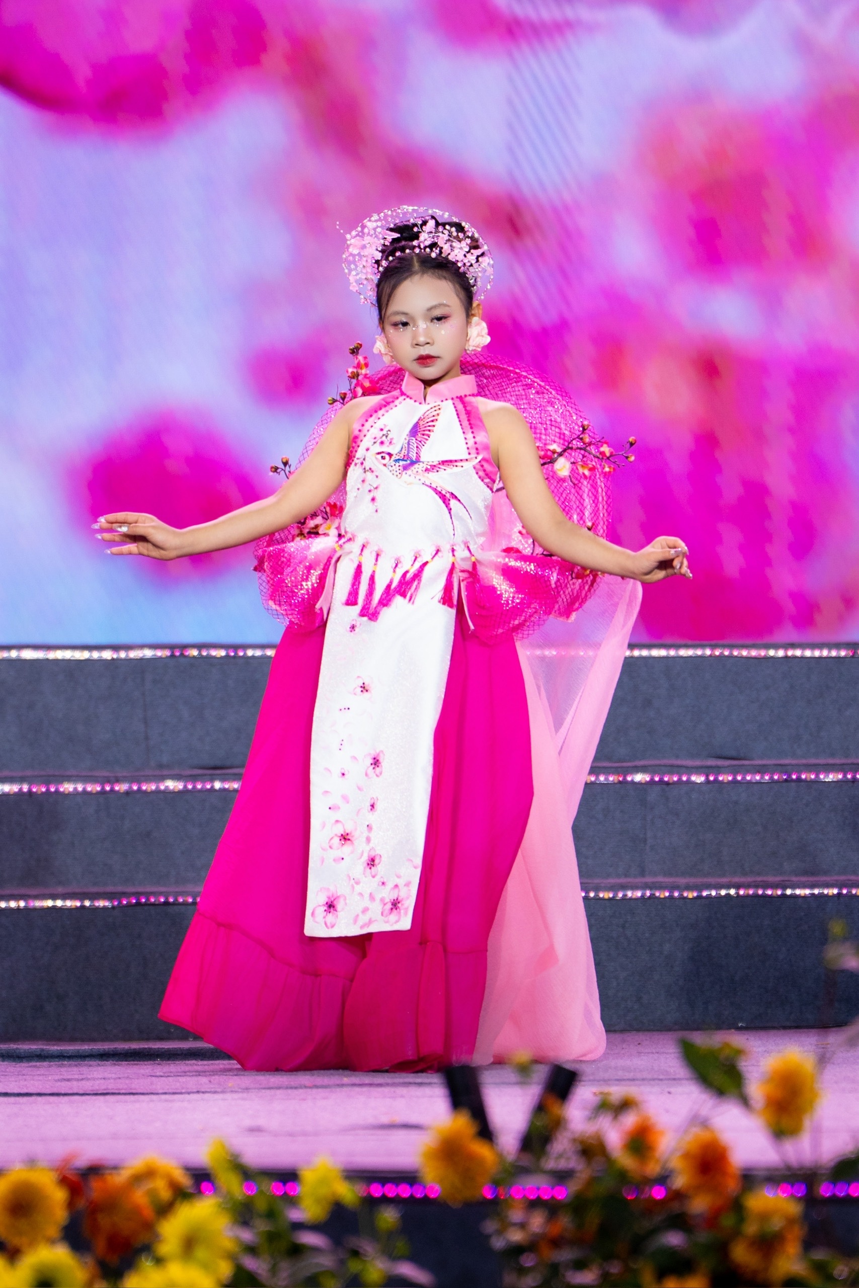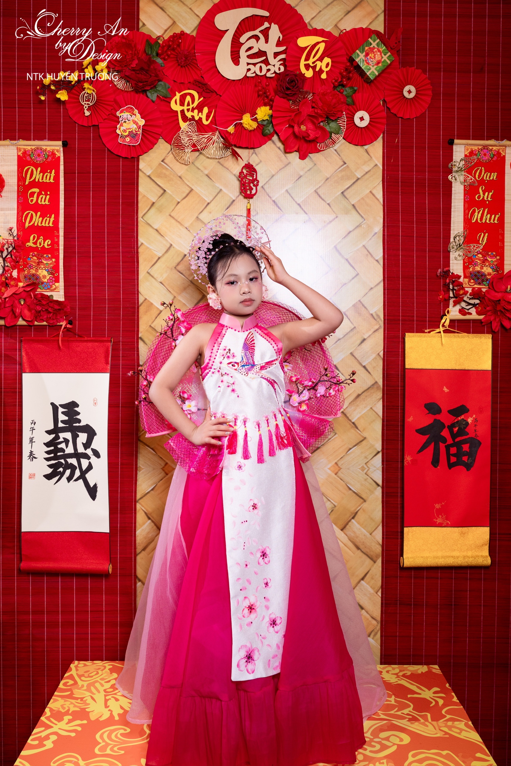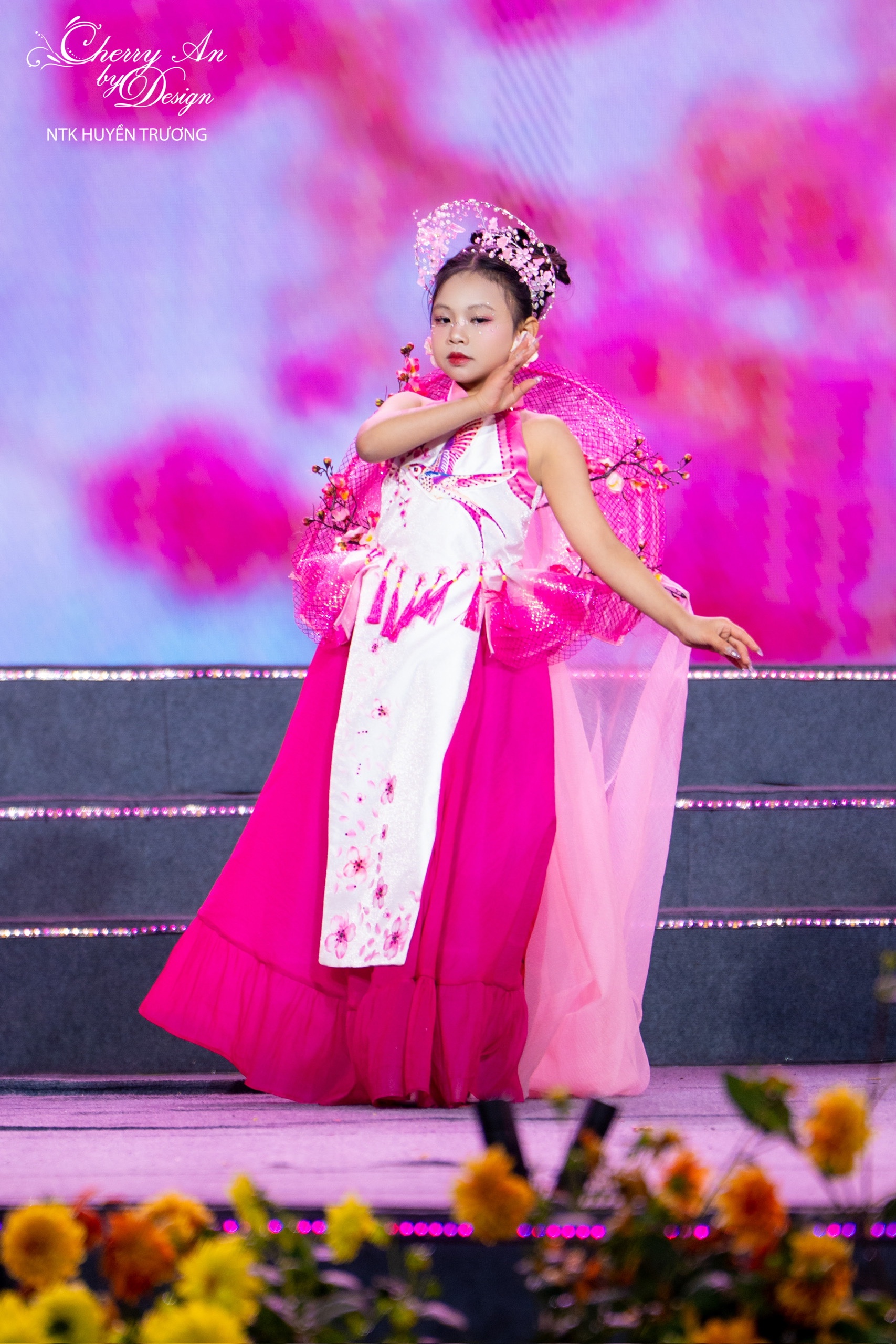 Cô bé khoe vẻ đẹp dịu dàng nhưng mạnh mẽ với chiếc váy hồng đậm thêu họa tiết hoa anh đào tinh xảo. Phần thiết kế của bộ trang phục không chỉ thể hiện vẻ đẹp của thiên nhiên mà còn mang đậm tính nghệ thuật, với những chi tiết lông công mềm mại ôm trọn bờ vai, kết hợp hài hòa với phông nền lễ hội Tết Việt. Dáng đi tự tin, thần thái kiêu sa.