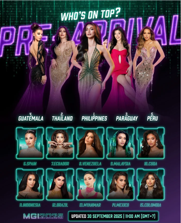 Mới đây, nàng hậu đón nhận một thông tin kém vui liên quan đến phần bình chọn trực tuyến tại Miss Grand International 2025. Theo đó, bảng xếp hạng bình chọn Top 10 Pre-Arrival, hạng mục do khán giả toàn cầu bầu chọn nhằm tìm ra 10 gương mặt được yêu thích trước thềm cuộc thi, hiện không ghi nhận sự xuất hiện của đại diện Việt Nam.