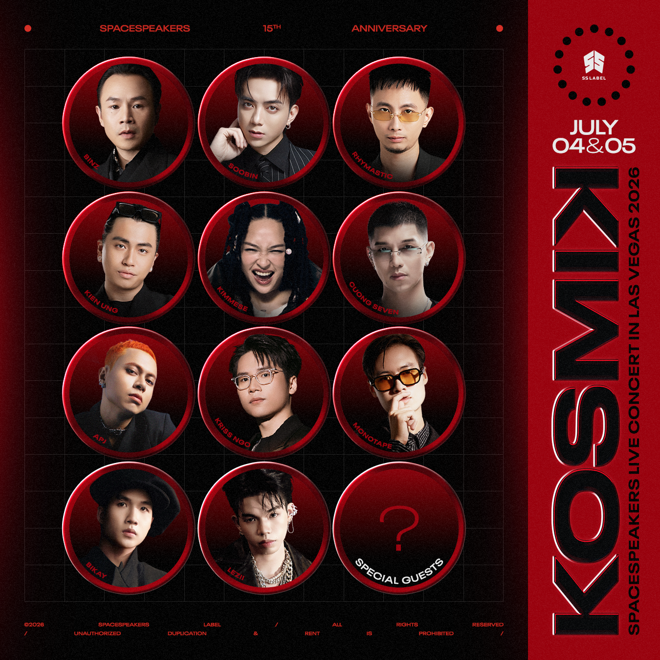 Kỷ niệm 15 năm hoạt động, SpaceSpeakers Label vừa công bố đầy đủ dàn nghệ sĩ tham gia KOSMIK Live Concert 2026, dự kiến diễn ra trong hai đêm 4 và 5-7 tại Las Vegas (Mỹ).