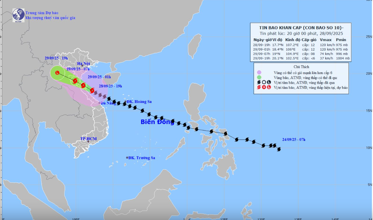 Theo Trung tâm Dự báo Khí tượng Thủy văn Quốc gia, ngày 29-9: Bão số 10 đi sâu vào đất liền, nhiều khu vực mưa to, cục bộ có nơi mưa rất to. Dự báo, đến 7 giờ ngày 29-9, bão trên đất liền các tỉnh Nghệ An – Hà Tĩnh với sức gió mạnh