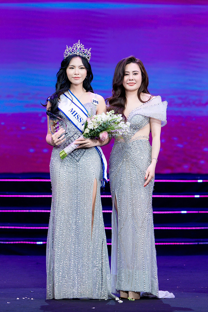 Khoảnh khắc Hoa hậu Nguyễn Trần Hà Linh nhận vương miện hoa hậu do Hoa hậu Quý bà hòa bình thế giới Phan Kim Oanh trao
