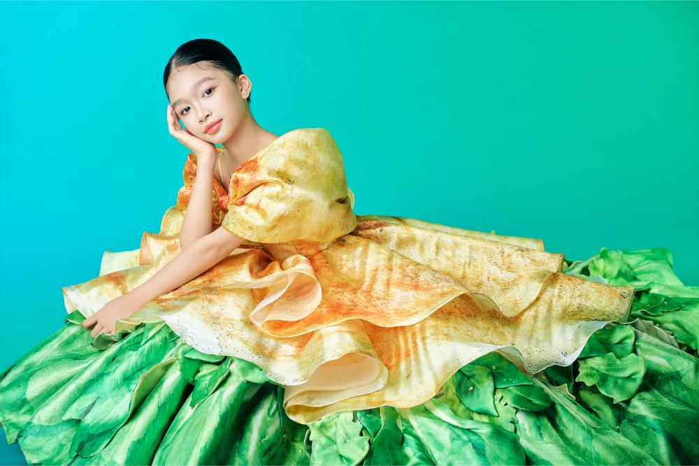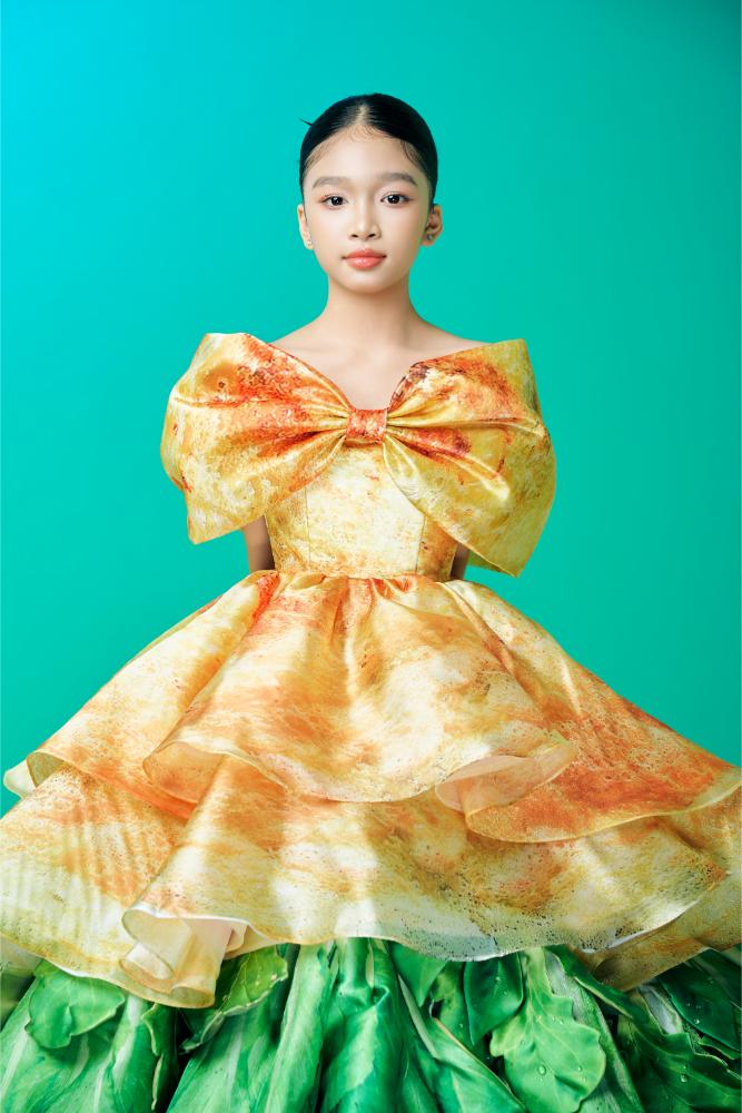 Thiết kế bánh xèo mang đến cảm giác gần gũi ngay từ cái nhìn đầu tiên. Tông vàng nghệ, vàng nâu được xử lý loang nhẹ gợi hình ảnh mặt bánh xèo vừa tráng, kết hợp sắc xanh lá ở phần chân váy như lớp lá lót quen thuộc trong ẩm thực miền Nam. Chi tiết vai trễ cùng nơ lớn bản rộng giúp tổng thể thêm mềm mại, tạo điểm nhấn thị giác rõ ràng nhưng không làm mất đi nét hồn nhiên của mẫu nhí.