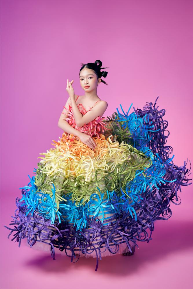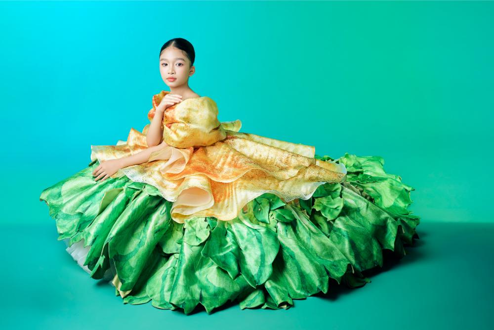 Ba thiết kế xuất hiện trong bộ ảnh là phiên bản size Kid được NTK Nguyễn Minh Công làm lại từ bộ sưu tập từng trình làng tại triển lãm “Miệt Cù Lao”- dự án giúp anh xác lập Kỷ lục Việt Nam. Việc đưa những thiết kế mang tính trình diễn cao xuống kích thước trẻ em đòi hỏi sự tiết chế và tinh chỉnh khéo léo để vừa giữ tinh thần nguyên bản vừa đảm bảo sự thoải mái cho các bé.