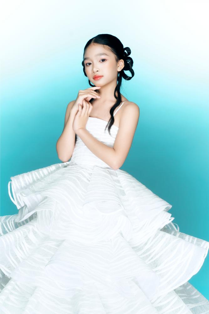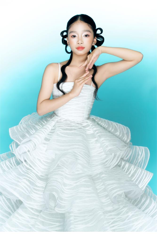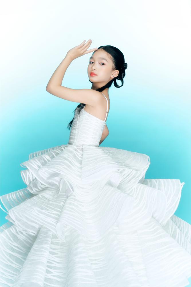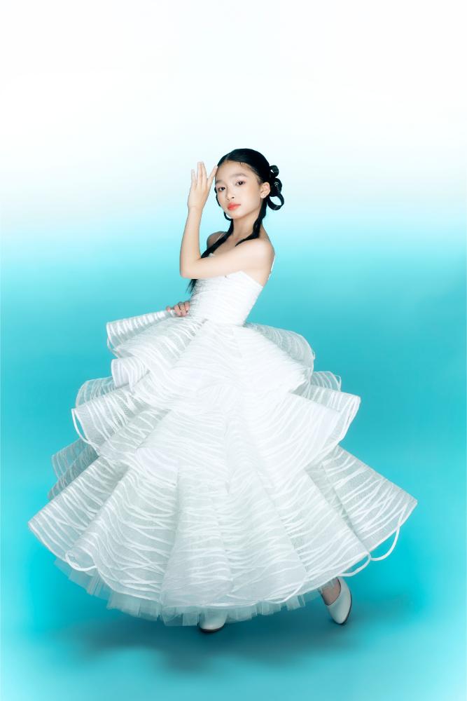 Trái lại, thiết kế bánh rế lại mang tinh thần nhẹ nhàng, thanh khiết. Váy được thực hiện với gam trắng trong, trắng sữa pha ánh ngọc, phom dáng xếp tầng mềm mại. Những đường vân gợn mảnh trên bề mặt vải gợi liên tưởng đến các sợi bánh rế mỏng, giòn, được đan đều tay. Khi Ruby Tâm Nhi di chuyển, từng lớp váy khẽ lay động tạo cảm giác bay bổng, trong trẻo đúng với lứa tuổi.