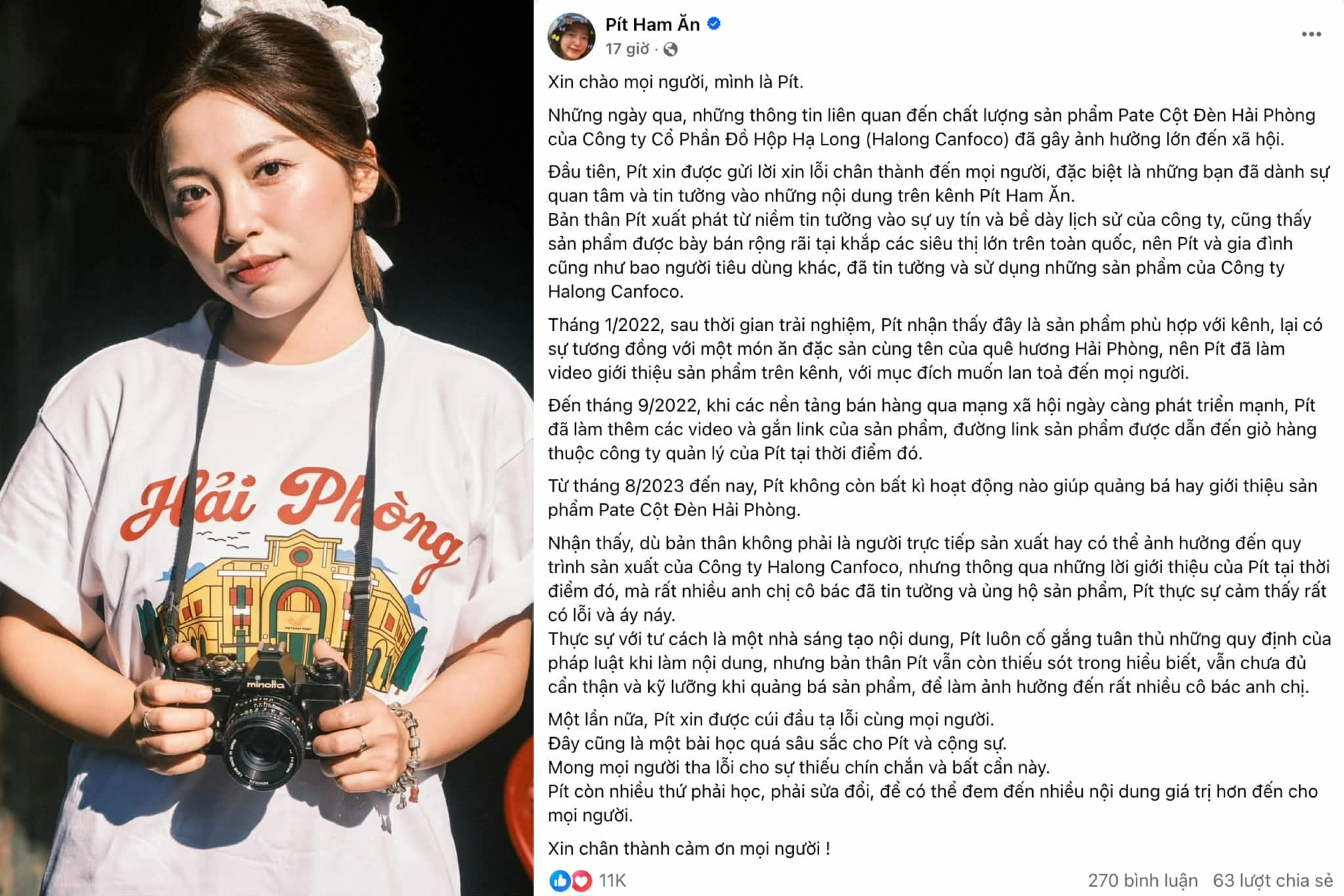 Cũng theo nhà sáng tạo nội dung, tháng 8.2023, cô không còn bất kỳ hoạt động nào giúp quảng bá hay giới thiệu sản phẩm pate cột đèn Hải Phòng. “Nhận thấy, dù bản thân không phải là người trực tiếp sản xuất hay có thể ảnh hưởng đến quy trình sản xuất của Công ty Halong Canfoco, nhưng thông qua những lời giới thiệu của Pít tại thời điểm đó, mà rất nhiều anh chị cô bác đã tin tưởng và ủng hộ sản phẩm, Pít thực sự cảm thấy rất có lỗi và áy náy”, nhà sáng tạo nội dung chia sẻ.
