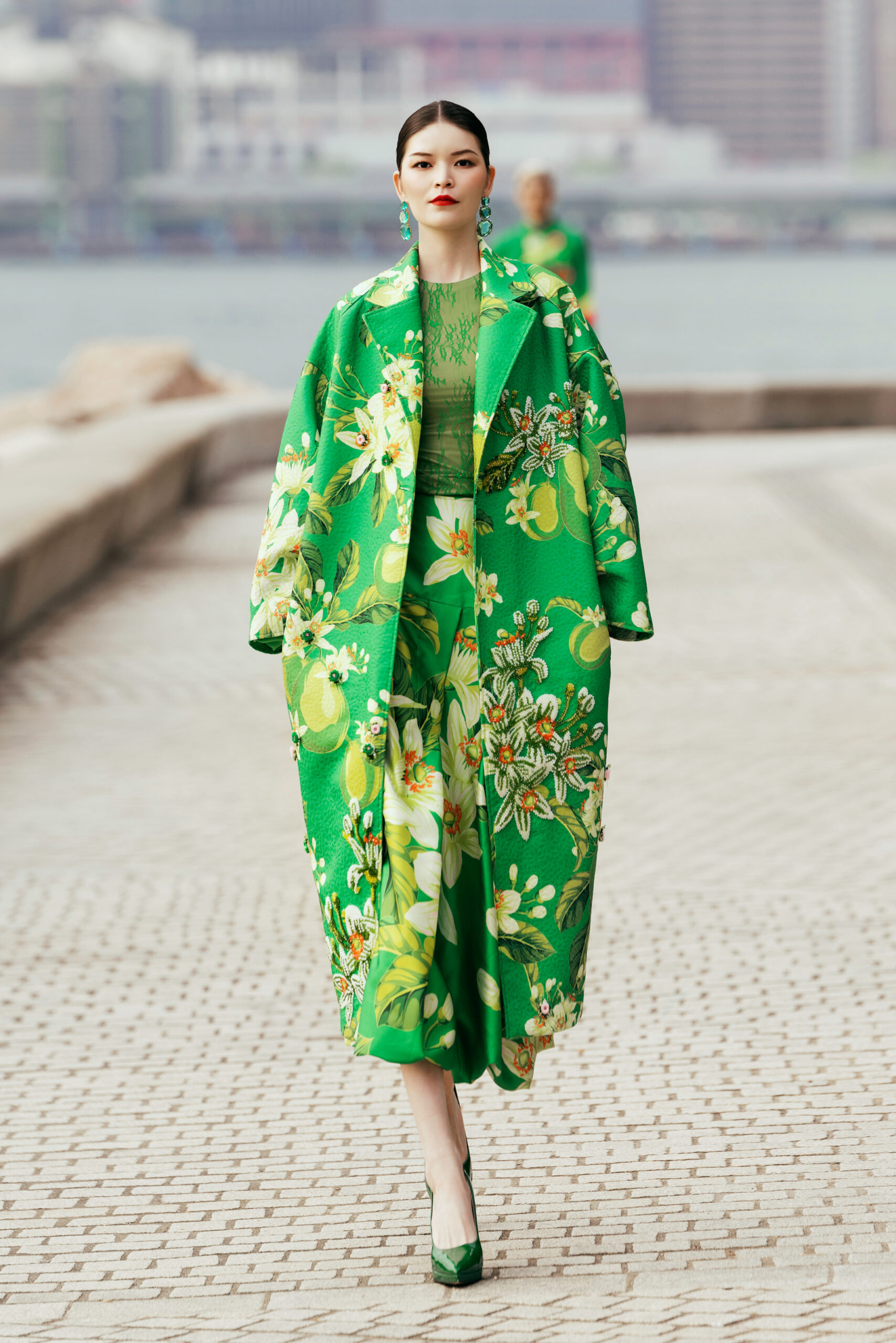 Bảng màu của BST trải dài từ đỏ son, fuchsia, xanh lục, vàng, đến đa sắc, tạo nên một nhịp điệu thị giác mạnh mẽ trên runway ngoài trời. Các gam màu rực rỡ không chỉ mang tinh thần lễ hội của mùa Holiday mà còn tương phản rõ nét với sắc xám, xanh của đô thị và mặt nước, giúp từng thiết kế trở thành một điểm nhấn thị giác độc lập.