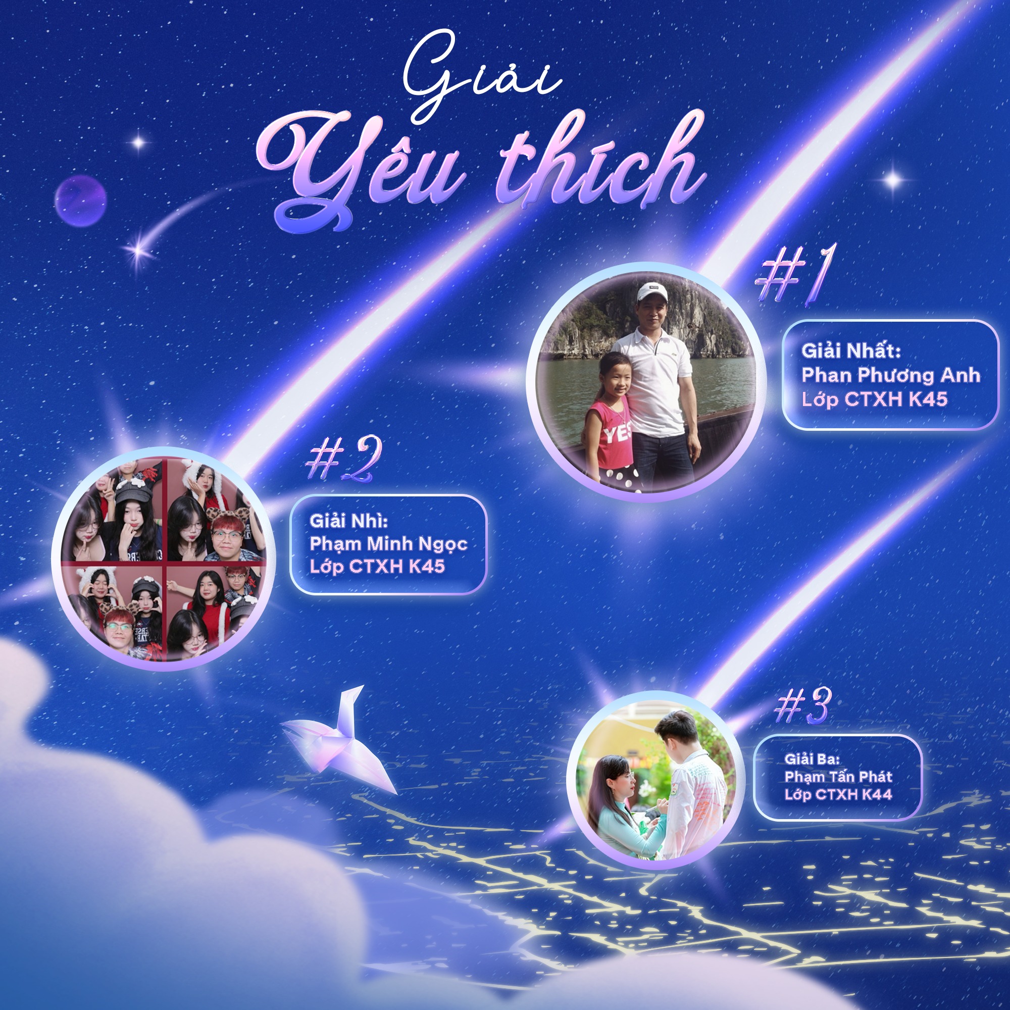 Sau hơn hai tuần phát động và bình chọn sôi nổi, hành trình truyền cảm hứng của Dreamscape đã chính thức khép lại. Vượt qua nhiều bài dự thi ấn tượng, những gương mặt tiêu biểu nhất đã được xướng tên . Ở hạng mục “Giải yêu thích”, Phan Phương Anh (Lớp CTXH K45) đã xuất sắc giành Giải nhất; Phạm Minh Ngọc (Lớp CTXH K45) và Phạm Tấn Phát (Lớp CTXH K44) lần lượt nhận giải Nhì và giải Ba. Bên cạnh đó, Nguyễn Thị Ngọc Vân (Lớp TTĐPT A3K45) thành công ghi tên mình vào “Giải ấn tượng”.
